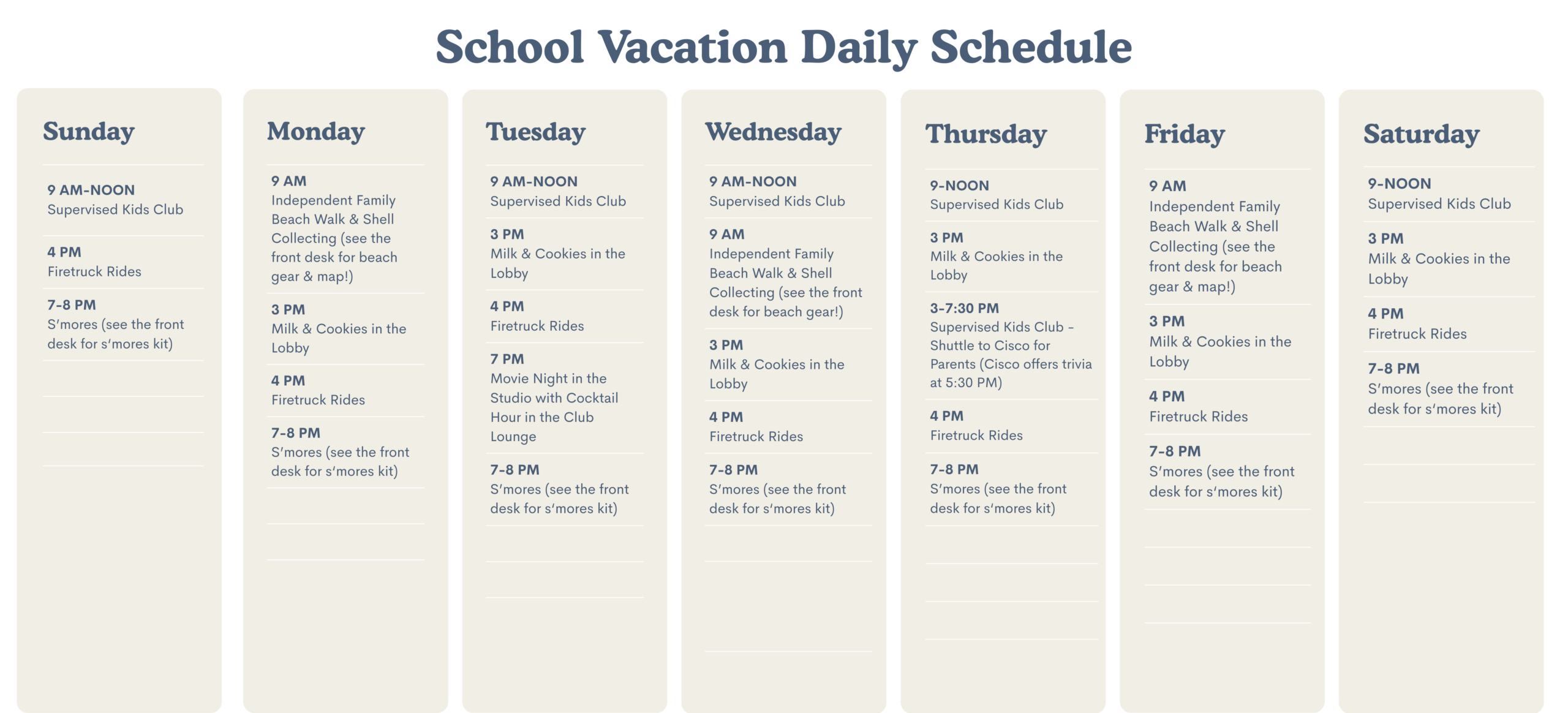 Hop aboard our antique firetruck, and we’ll show you around the island in style. Take a dip in our outdoor pool* or warm up in the hot tub, enjoy nightly s’mores and meet new friends around our fire pits on the front porch.